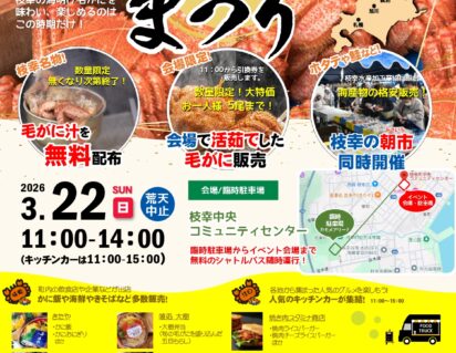 最新情報 NEWS イベント 2026.03.13 【チラシ完成】第3回 枝幸海明け毛がにまつり イベント 2026.02.27 【開催決定】第3回 枝幸海明け毛がにまつり お知らせ 2026.02.27 【観光案内所】2026年3月定休日のお知らせ お知らせ 2026.02.15 枝幸町観光協会からのお知らせです【パート職員募集】 イベント 2026.02.06 オホーツク枝幸フェス2026inチカホ 特集 PICKUP 絶景を求めて。 気持ちの良い風を感じながら、枝幸の絶景を見にお出かけしませんか?キャンプや観光に訪れたい、この時期におすすめのスポット、グルメ情報を集めました。 More テーマ別の"えさし" 見る・遊ぶ 枝幸の観光スポットや、こどもから大人まで楽しめるレジャースポットをご紹介。家族や友人、恋人と見て楽しい場所をCHECK! More 食べる どこか懐かしさを感じる枝幸グルメ!飲食店・スイーツ店などをご紹介。お気に入りの店を見つけてみよう! More 体験・学ぶ こどもから大人まで楽しめる体験施設や、学習イベントをご紹介。枝幸だから出来るアクティビティや、学校では教えてくれないことを学べるチャンス! More 買う 海の恵み・山の恵み。枝幸のお土産グルメやグッズをご紹介。もちろん、自分へのお土産にもおすすめですよ! More 泊まる オホーツク海をのぞむ海側と森林に囲まれた山側に一軒ずつある温泉ホテル。また、山側にあるコテージでもゆったりと「枝幸時間」を味わいませんか? More イベント 水揚げ量日本一を誇る「毛がに」を求めて全国から訪れる一大イベント「枝幸かにまつり」をはじめ、旬の味覚を楽しむイベントをご紹介! More みんなで投稿 More